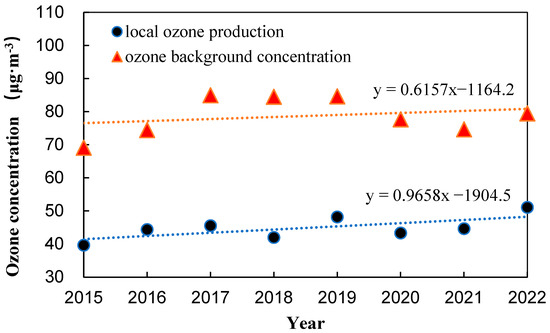 The TCEQ methodology was applied to estimate daily regional background and local ozone concentrations, as well as to calculate annual mean values (see Figure 6). From 2015 to 2022, both background and locally generated ozone concentrations in the YRD region demonstrated a gradual upward trend, highlighting a worsening ozone pollution scenario with annual fluctuations. Between 2015 and 2017, background ozone levels rose significantly, while locally generated ozone increased at a slower rate, suggesting that transboundary transport contributed more substantially to the overall ozone levels within the region. From 2017 to 2019, background concentrations leveled off, while local ozone production rebounded after a notable decline in 2018. This pattern implies that the reduction in ozone levels during 2018 was primarily due to decreased local production. Between 2019 and 2021, background concentrations declined rapidly, while locally generated ozone initially decreased before increasing again. The rapid decline of background ozone concentrations could probably be connected with the lockdown during COVID-19. In 2022, both the background and local ozone concentrations spiked, attributed to intense ozone formation linked to one of the most severe prolonged dry heat events recorded since monitoring systems were established in the Yangtze River Basin.