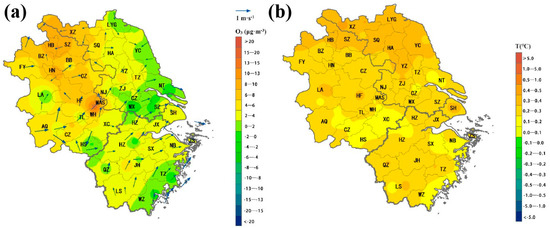 (a) Composite wind field anomaly from May to September for 2017, 2018, and 2019, alongside the 8 h average O3 concentration anomaly; (b) composite temperature anomaly observed in 2016, 2017, 2019, and 2022.