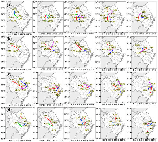 Ozone transport dynamics among cities in the YRD region are notably significant. To analyze intercity transport patterns across different pollution types, we integrated five distinct ozone concentration distribution categories, as outlined by Cao et al. [30]. Using the TOR (Transport Rate) method, we calculated 72 h transport trajectories and transmission rates for these distribution types across four major cities—Hefei, Nanjing, Shanghai, and Hangzhou (see Figure 8). The results reveal that intercity transport contributions within the YRD range from 45.2% to 65.1%, surpassing contributions from local ozone generation, consistent with previous findings [34]. As shown in Figure 8, the primary source direction of O3 pollutants is less correlated with the distribution type; instead, the pollution distribution type primarily dictates both initial transport mechanisms and intercity transport proportions. For example, in Hefei, ozone concentrations are predominantly influenced by southerly transport routes, especially along the Anqing–Chizhou–Hefei corridor, contributing 32.3–42.1% of Hefei’s ozone levels. Nanjing’s ozone is chiefly affected by external provincial transports, with the most substantial northwestward flow occurring along the Huaibei–Bengbu–Chuzhou–Nanjing route, contributing 28.2–39.9%. In contrast, over half of Shanghai’s ozone originates from areas outside the city, predominantly from the west–southwest direction, with significant transport occurring along the Wuhu–Xuancheng–Huzhou pathway through the Taihu Basin into Shanghai (transport contribution: 41.8–51.2%). Short-distance transfers from the Taihu Basin directly into Shanghai are also notable, particularly within bicentric and inland distribution types (contribution: 36.2–47.2%). The Taihu Basin thus emerges as a crucial ozone generation zone within the YRD (refer to Figure 4b). Among these four key cities, Hangzhou shows the least influence from intercity O3 transport. Its primary transport channel is the Huaian–Yangzhou–Circum–Taihu Basin–Huzhou–Hangzhou route, with a transport contribution ranging from 9.9% to 24.5%. Similar to Shanghai, the Taihu Basin area serves as an essential O3 source for Hangzhou, indicating that southern YRD cities are significantly impacted by polluted air masses around Taihu Lake. Conversely, central and northern cities benefit from trans-regional ozone transport from Northern Jiangsu Province and North China.