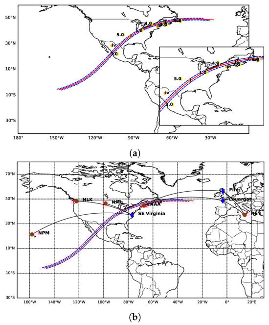 (a) The map illustrates the locations of the GNSS-IGS (yellow diamond) and UNAVCO-IGS (orange circle) stations with the totality belt of the solar eclipse. The red curve depicts the central track of totality. The upper and lower bounds of the total eclipse, represented by the blue dashed curves, indicate the regions where a total eclipse was observed. Outside these dashed curves, only a partial eclipse was visible. (b) Similar map with VLF transmitters with four VLF transmitters (red circles), three receiving locations (blue diamonds) and the great circle path between them.