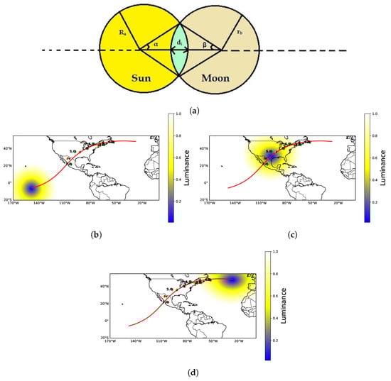 (a) Geometric representation of the Sun and the Moon during a solar eclipse []. (b–d) The luminance and lunar shadow at (a) start, (b) mid and (c) end of the eclipse over the totality belt. The colorbar represents the different luminisence value over the course of the eclipse.