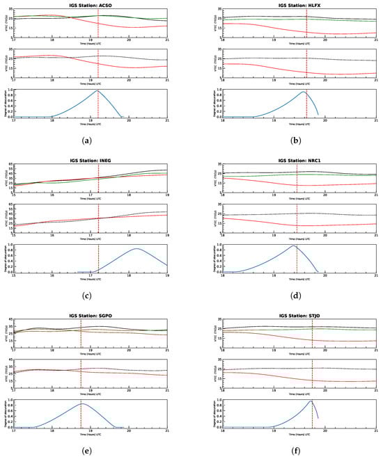Temporal variation in the profile as a function of time (UTC) in hours during the solar eclipse as observed from different GNSS-IGS stations as (a) ACSO, (b) HLFX, (c) INEG, (d) NRC1, (e) SGPO and (f) STJO. The upper panel of each profile illustrates the variation for three consecutive days: the day before the eclipse (black curve), the day of the eclipse (red curve), and the day after the eclipse (green curve). The middle panel shows the mean variations of the two non-eclipse days (black dashed curve) compared to the eclipse day (red curve). The lower panel indicates the degree of obscuration on the eclipse day.