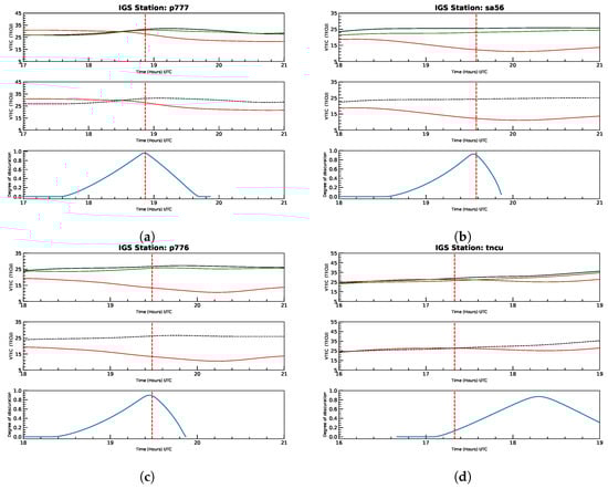 Temporal variation of the profile as a function of time (UTC) in hours during the solar eclipse for the four UNAVCO-IGS stations: (a) p777, (b) sa56, (c) p776 and (d) tncu. The figure format and color codes are consistent with those in Figure 3.