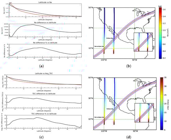 (a) The temporal variation of profiles as a function of latitude as observed from the Swarm satellite. The upper panel shows the profiles for the eclipse day (red curve) and the non-eclipse day (black curve). The middle panel illustrates the difference in profiles between the eclipse day and the non-eclipse day. The lower panel presents the percentage difference in profiles. (b) The spatiotemporal variation of along the trajectory of the Swarm-B satellite. (c) The temporal variation in the average as a function of latitude as observed from the Swarm satellite. The figure format and color codes are the same as in Figure 5a. (d) The spatiotemporal profile is shown over the satellite track of the Swarm satellite for the eclipse and non-eclipse days.
