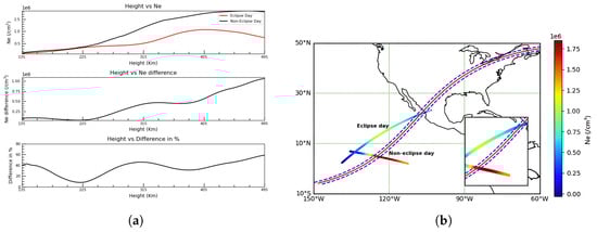(a) profiles during eclipse and non-eclipse days observed from the COSMIC-2 satellite constellation. The upper panel of each profile illustrates the variation of across a range of latitudes and longitudes, depicting data for eclipse (red curve) and non-eclipse days (black curve). The middle panel displays the difference in values between non-eclipse and eclipse days. The lower panel depicts the percentage change in the profile between eclipse and non-eclipse days. (b) The spatiotemporal profile is shown over the Cosmic satellite track for the eclipse and non-eclipse days.