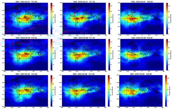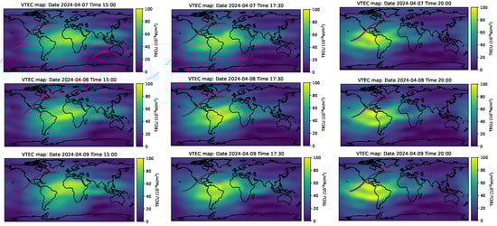 Spatiotemporal profile of from 15:00 to 20:00 UTC as observed from GIM data for April 7 (top), 8 (middle), and 9 (bottom), 2024.
