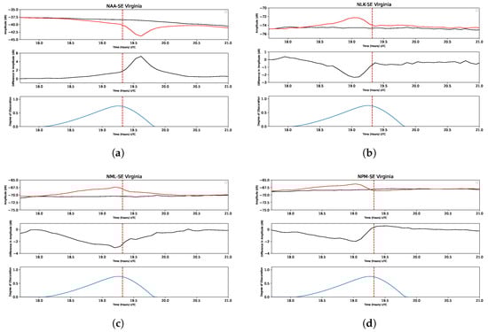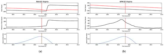 In Figure 11a,b, the corresponding phase change is presented for the transmitters NPM and NAA. The negative phase change is 63.5° for NPM, and the positive phase change observed is 283.5° for NAA. It is noted that the phase data for the stations NML and NLK are not appropriate for the analysis (corrupted), so these are not presented.