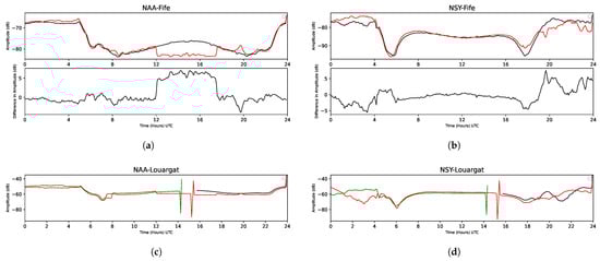 VLF signal amplitude profiles during the eclipse and non-eclipse days observed from a VLF receiver located in Fife, Scotland, for the transmitter–receiver path (a) NAA-Fife and (b) NSY-Fife, plotted as a function of time (UTC) in hours. The upper row of each panel compares amplitude variations for the eclipse day (red curve) and a non-eclipse day (black curve), while the middle row illustrates the amplitude profile difference between the eclipse and non-eclipse days. Similarly, the temporal variation in amplitude profiles during both eclipse and non-eclipse days observed from a VLF receiver located in Louargat, France, for the transmitter–receiver path (c) NAA-Louargat and (d) NSY-Louargat, is plotted as a function of time (UTC) in hours. The red curve represents the eclipse day, and the black and green curves represent non-eclipse days.