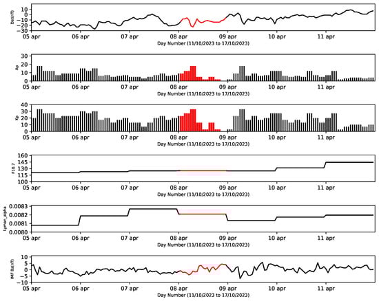 Temporal variation of Dst, Ap, Kp, Solar Flux (F10.7), Lyman alpha, and IMF Bz for the time period 5–11 April 2024. The red parts of the curves and histograms depict the variation specifically for the eclipse day.