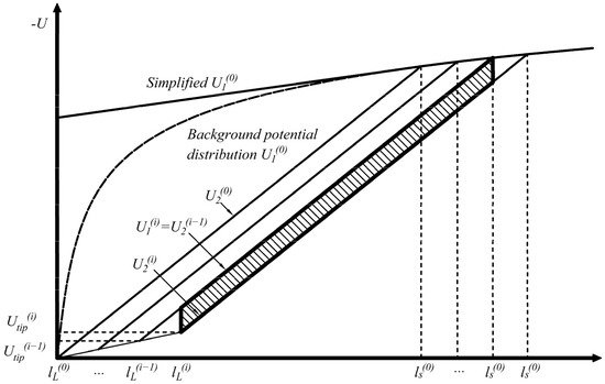 When the collected charge is greater than 1 μC, it can be assumed that the temperature in the channel has reached 1500 K and the streamer has fulfilled the conditions for the transition to the leader. If the leader develops continuously, the potential at step i can be expressed as follows: