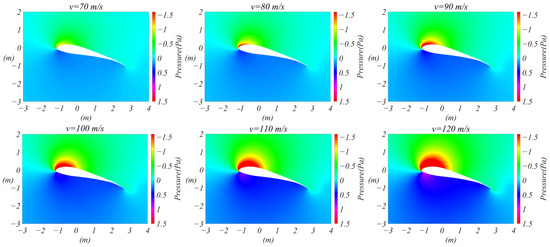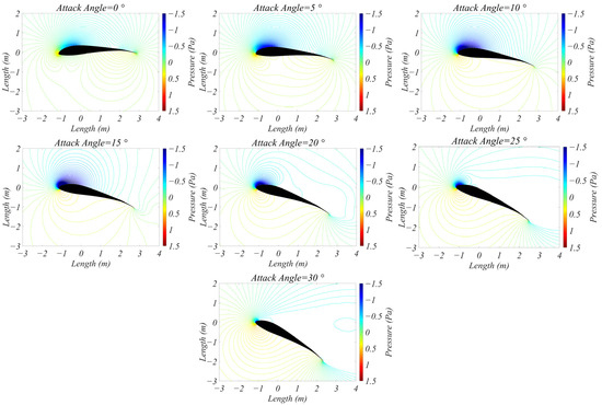 To determine the air pressure distribution around the airfoil as it is in different positions, the air pressure distribution around the airfoil at different airspeeds and angle-of-attack conditions is investigated. The angle of attack is discussed first. The angle of attack for takeoff and landing differs according to the aircraft type, weight, speed, and flight conditions. The angle of takeoff for civil aircraft is usually between 10° and 20°, while the angle of landing is usually between 2° and 5°. Considering a certain operating margin, the angle of attack is set to be between 0° and 30°, the airspeed is taken to be 100 m/s, and the flight altitude is taken to be the minimum descent altitude (MDA) of 160 m in the approach phase. The final simulation results are shown in Figure 3; the air pressure field on the upper surface of the leading edge is smaller than that on the bottom surface, and, as the angle of attack increases, the difference tends to increase before decreasing.