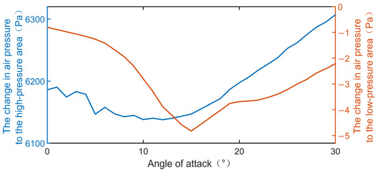 As illustrated in Figure 4, the maximum air pressure difference is observed at an angle of attack of 15°, with a difference of up to 5.44 × 104 Pa. As the angle of attack is further increased, the airflow on the airfoil surface becomes an unstable state, which results in the separation phenomenon. The critical angle of attack is not a fixed value but varies with different factors, including the geometry, aerodynamic shape, angle of attack, airspeed, viscosity of the flow, and so on.