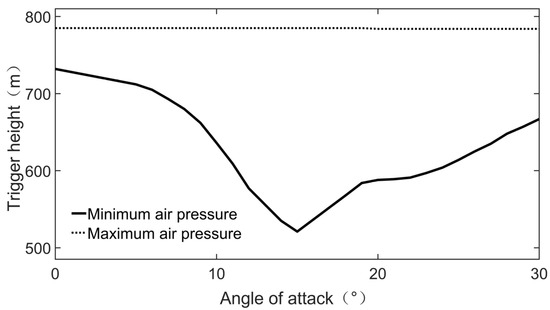 Figure 5. The trigger height of different attack angles for minimum and maximum air pressure regions.