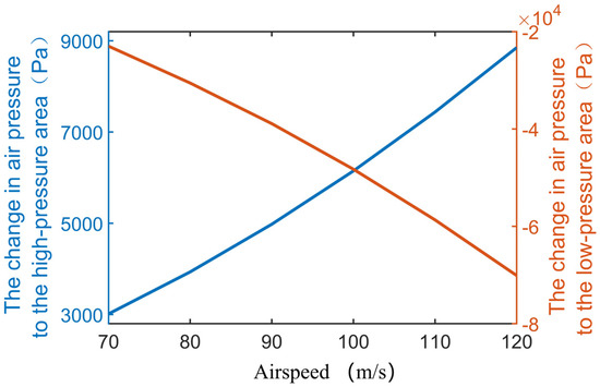 From the above discussion, it is clear that the angle of attack and airspeed can be considered to be the key factors affecting the lightning strike characteristics of aircraft. In the above study, 15° was found to be the lightning strike signature point; therefore, in the next study of the lightning strike problem for different airspeeds, the angle of attack was fixed at 15°. The same research steps were applied by taking the aircraft velocity relative to the air as a variable only. According to the flight performance of the airplane in the phases of approach and departure, a number of representative airspeeds were selected in the range of 70 m/s to 120 m/s, and the distribution of the air pressure field at different airspeeds was simulated, as shown in Figure 6. The results showed that the relative air pressure in the low-pressure region could reach −7.01 × 104 Pa when the airspeed reached 120 m/s and that the relative air pressure in the high-pressure region at that time was 8.85 × 103 Pa, whereas it was −2.30 × 104 Pa and 3.02 × 103 Pa for the airspeed of 70 m/s, respectively. It can be found that the difference between the high-pressure and low-pressure areas increases with the acceleration of the airspeed, as shown in Figure 7. Combined with Equation (3), it can be concluded that the difference in air pressure increases will lead to a change in the E s t r in the streamer zone, which will affect the lightning strike characteristics eventually.