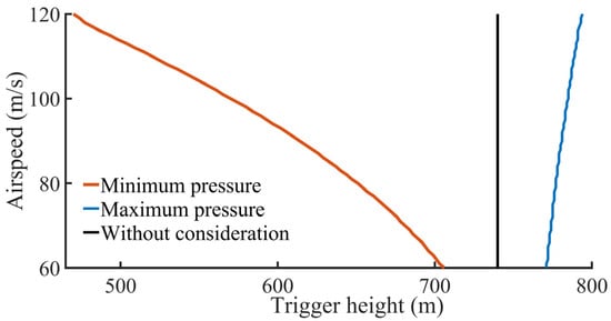 Figure 8. The trigger height of different velocities for minimum and maximum air pressure regions.