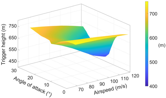 Figure 9. The trigger height for different airspeeds and angles of attack.