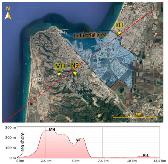 Map of the Haifa Bay Area and the location of three ECE facilities participating in the study. Below, a topographic relief cross-section of the dotted red line.