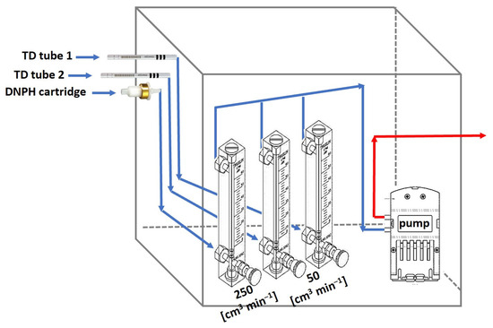 Self-designed air sampling system consisting of a diaphragm pump placed downstream and three sampling lines, each including an adsorber and a flow regulator.
