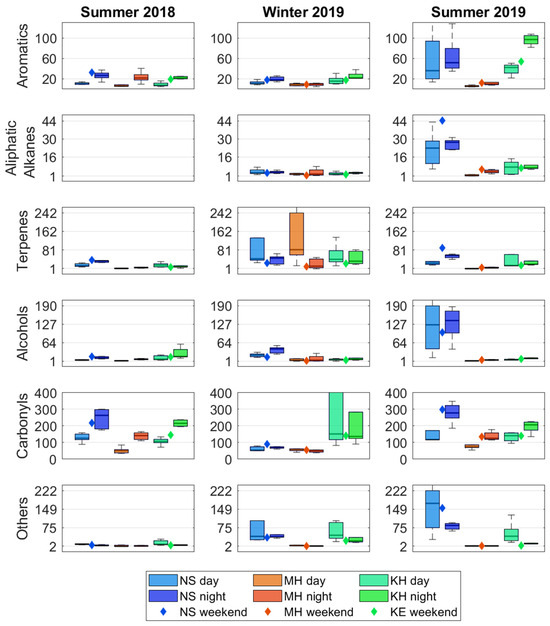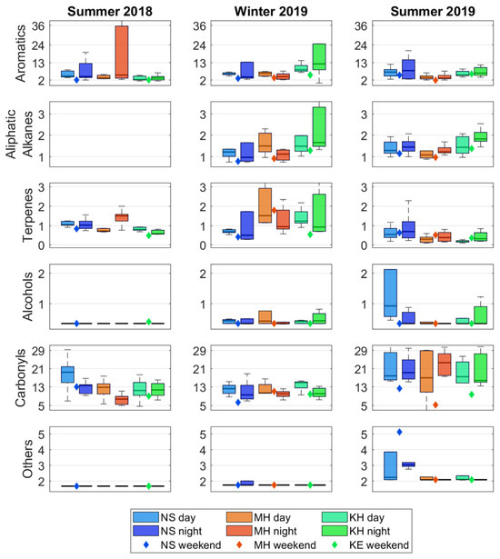 Figure 3 illustrates the summative concentrations of each compound group (μg m−3), categorized by both spatial distribution across three locations and temporal distribution across day/night and summer/winter campaigns. The carbonyl group obtained higher mean daytime concentrations, mostly evident in summer 2018 (Figure 3). Although this trend is less pronounced for acetaldehyde, nonanal, and acetone (Table 1), formaldehyde consistently exhibits higher daytime concentrations across all three locations and seasons (Figure S2). Higher variability in the carbonyl concentrations was observed during the summer campaigns. Overall, these trends suggest additional secondary sources of carbonyls, particularly formaldehyde, likely from photo-oxidation processes. The aromatic compounds group is mainly dominated by toluene, xylene (m+p and o-), and ethylbenzene. This is expected for outdoor urban environments, as these compounds (part of the BTEX family) are generally attributed to the transportation and industrial sources. Indeed, through all three campaigns, toluene, m+p-xylene, o-xylene, and ethylbenzene showed moderate-to-strong correlations with each other (Figure S3), indicating a common source. Excluding toluene, the average concentrations of aromatic compounds show no significant differences between day and night (Table 1). However, the nighttime concentrations show greater variability, which was consistently observed at the NS location and also evident at MH and KH (Figure 3). The latter trend probably reflects the impact of local meteorology; the calm winds at nighttime and decreasing surface temperature lapse rate result in increasing concentrations of the pollutants emitted from local ground sources like transportation. The terpene group is dominated by α-pinene, which is known to be of biogenic origin and emitted from conifer foliage [35]. Outdoor terpene measurements were generally close to the MDL, which is expected given that the study region is a Mediterranean urban area. Contrary to the typical reduction in biogenic VOC emissions at lower temperatures [36], slightly higher terpene concentrations (with stronger variability) were measured during winter. Terpenes are converted to aldehydes and undergo various reactions [37], primarily with oxidants that are formed by photochemical reactions, which may explain their slower degradation during winter.