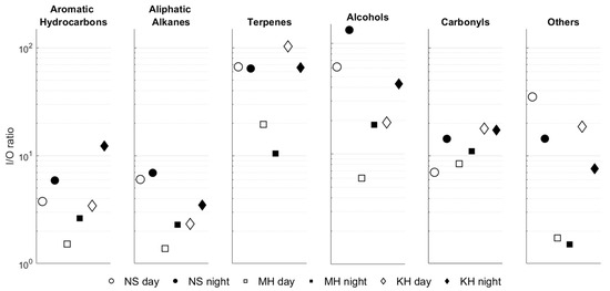 The I/O ratios of each compound group are depicted in Figure 4 (values for each compound are provided in Figures S5–S10). All of the measured VOCs show an I/O ratio greater than unity, consistent with previous studies [23,26,39,40,41,42], which rarely report I/O ratios below unity, as many compounds have mixed indoor and outdoor emission sources. According to previous findings and classification [23,42], a cut-off value of 10 was applied here to distinguish between groups with or without significant indoor emission source.