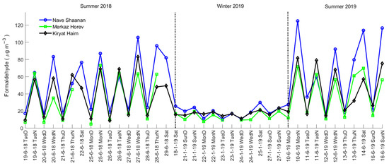 Overall, the outdoor environment shows no strong diurnal variations. Furthermore, despite differences in the geographic location within the metropolitan area, no significant spatial differences were observed. Two general trends arising from Figure 3 that are worth noting are the lower values during the weekend and the higher variability in air concentrations at night (especially for aromatic compounds). The former is expected for outdoor environments controlled by anthropogenic VOC emissions, which are reduced during weekends. This may also explain the lower carbonyl concentrations during the weekend (summer 2019), as many hydrocarbons are precursors for formaldehyde production by photo-oxidation chemistry. Support for the role of local meteorology (near-ground nighttime temperature gradient) on outdoor nighttime concentrations and variability is provided by measurements on three specific nights (25 June 2018, 27 June 2018, 22 January 2019). Despite the expectation of lower emissions from transportation and industry at night, particularly high concentrations were observed on these dates for various compounds (including, m+p and o-xylene, ethylbenzene, and nonane) in two of the daycares (KH and NS). An examination of temperature measurements at monitoring stations located at different altitudes in the region indicates that, on those dates, the temperature profile reached a local maximum at 250 m height, resulting in a temperature inversion at lower altitudes (Figure S4), where daycares KH and NS are located. None of the measured outdoor concentrations were above the environmentally permitted values. Yet, the nighttime and daytime mean concentrations of formaldehyde were above the diurnal target value of 0.8 μg m−3 [38].