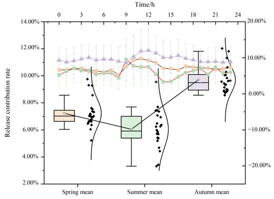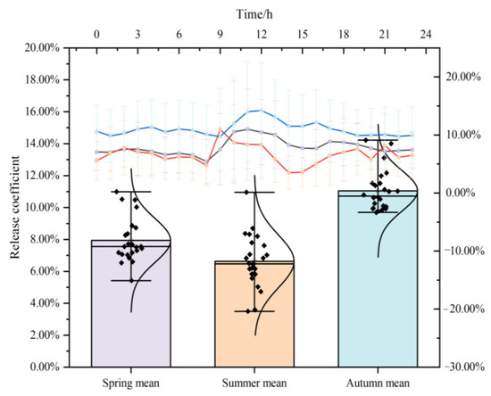 The ability of the forest to immediately release NAIs is represented by n (Figure 4), with a fluctuation range of 6.63–11.05% during the growing season. The seasonal daily average is 7.94 ± 3.55% in spring, 6.63 ± 3.78% in summer, and 11.05 ± 4.30% in autumn. The strongest ability to release NAIs immediately is at 11:00 in spring, with a second peak (8.86%) appearing at 17:00. The instant release ability is highest at 12:00 (14.22%) and 16:00 (12.17%) in autumn. The first peak (10.95%) appears at 9:00 in summer, and the second peak (8.20%) appears at 21:00.
