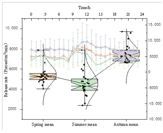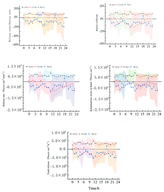 Daily release capacity: At 6:00 on cloudy days, the release capacity is the strongest, with L, n, s, v, and Z at 0.53%, 1.7%, 877.19 cells/cm2/min, 3.56 × 104 cells/cm2, and 9.67 × 104 cells/cm2, respectively. At 18:00 on rainy days, the release capacity is highest, with L, n, s, v, and Z values of 4.58%, 4.83%, 3.16 × 103 cells/cm2/min, 3.16 × 104 cells/cm2, and 1.90 × 105 cells/cm2, respectively.