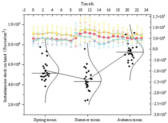 V represents NAIs released by the forest at a certain moment (Figure 6). The instantaneous standing stock range during the growing season is 4.48 × 104~7.34 × 103 pieces/cm2. The forest’s ability to release NAIs is most effective at 11:00 in the spring and autumn seasons, with the highest instantaneous standing stock (7.76 × 104 pieces/cm2, 9.17 × 104 pieces/cm2). In summer, the optimal values occur at 9:00 and 21:00, with instantaneous standing stock of 7.57 × 104 pieces/cm2 and 5.35 × 104 pieces/cm2, respectively. In the afternoon, the instantaneous standing stock significantly decreases, and the release effect is poor.