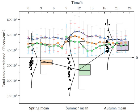 Taking the calculation of the total amount of NAIs released by forests per hour as an example, we analyze its trend changes (Figure 7). The range of hourly release during the growing season is 2.70 × 105~4.40 × 105 cells/cm2. The trend of total release in spring, summer, and autumn is relatively consistent, but the peak time is slightly different. At 9:00 in spring, the hourly release rate continued to gradually increase, reaching the first peak at 12:00 (4.40 × 105/cm2). The total release amount significantly decreased in the afternoon, and the second peak appeared at 17:00 (3.41 × 105/cm2). At 11:00 in autumn, the first peak (5.66 × 105/cm2) appeared, and at 17:00, the second peak (4.35 × 105/cm2) appeared. The peak time in summer has advanced, with the highest total release occurring between 8:00 and 9:00 (4.54 × 105 cells/cm2) and between 20:00 and 21:00 (3.21 × 105 cells/cm2), followed by further NAI release in the early morning and evening.