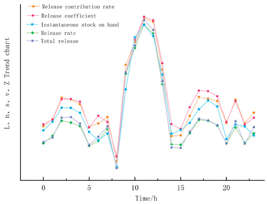 In summary, the daily variation trend of the five capacity indicators for forest release of NAIs is consistent with the NAIC model, indicating that the overall concentration of NAIs is mainly influenced by plants, and forests are the main source of total atmospheric NAI amount, which is less affected by other factors. From the trend chart of the five capacity indicators in Figure 8, it can be found that L, n, s, v, and Z fluctuate synchronously, indicating that as the forest contribution increases, the immediate release ability also strengthens, the release rate increases, and the release amount increases. The “change trend” of each indicator is consistent (Figure 8), indicating a “linkage” relationship between these indicators.