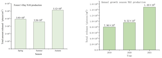 We explored the impact of forests on NAI production from the perspective of total release, and evaluated the effects of forest release of NAIs, as shown in Figure 9. The average daily “million level” NAI production can reach a minimum of “billion level” throughout the year. In different seasons, forests produce the highest daily NAI amount in autumn, with an average of 5.12 × 106/cm2, followed by spring at 3.93 × 106/cm2, and the lowest production in summer at 3.58 × 106/cm2. From 2019 to 2021, the production volume of NAIs has been increasing year by year, and the rates have been increasing by 19.6% in 2019–2020 and 56.5% in 2020–2021, respectively.