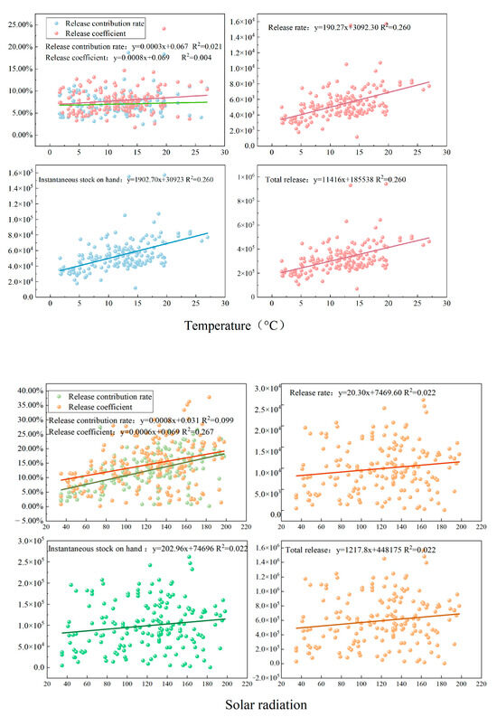 We used an Excel spreadsheet to filter and organize the obtained NAI data. The specific filtering method is as follows: (1) Discard abnormal data caused by instrument failure. (2) Multiple consecutive identical values are discarded. (3) Discard if there is a difference of three times or less than one-third between the values before and after. (4) Missing values are filled using the interpolation method [40]. We performed Pearson correlation analysis on the five capacity indicators with solar radiation and temperature using SPSS26.0 (IBM, Armonk, NY, USA) software. We plotted the release characteristics of the five capacity indicators with Origin2021 Pro (OriginLab, Northampton, MA, USA) software and linearly fit them with solar radiation and temperature.