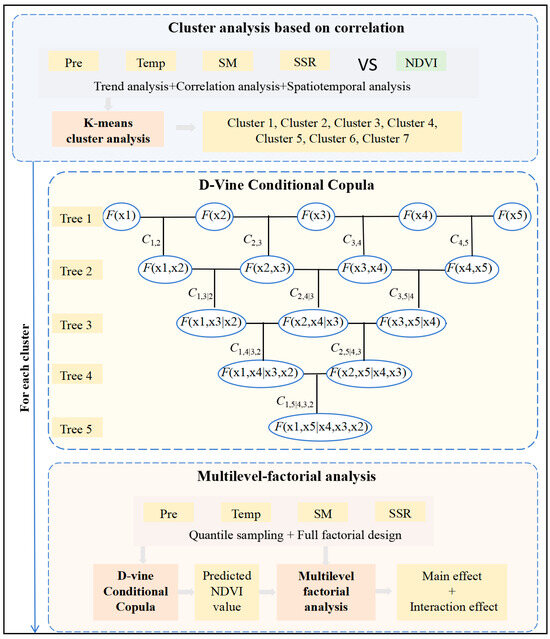 The framework of this study is shown in Figure 1. The trend of NDVI changes in China and the spatiotemporal heterogeneity of its correlation with precipitation, temperature, soil moisture, and net solar radiation at each grid point were analyzed. Given the spatial distribution of the correlation, the relationship between NDVI and climatic factors was classified into seven categories using K-means clustering analysis. The marginal distribution and multidimensional joint distribution of each cluster were fitted based on the copula. Climate combinations were input into a Vine Copula model, which was used to estimate the NDVI response under different climatic conditions. The climate factors and corresponding NDVI responses were subsequently input into a two-way factorial analysis to evaluate the main and interaction effects.