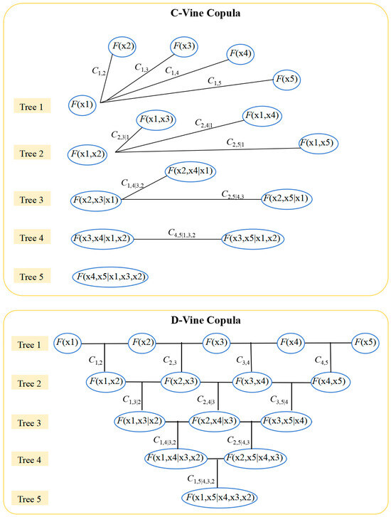 Based on the dimensionality of the data and the relationships among variables, an appropriate Vine structure (C-Vine or D-Vine) is selected. Model selection criteria such as AIC are used to determine the optimal tree structure and choose suitable low-dimensional copula types (e.g., Gaussian, t-distribution, or Gumbel copulas). In detail, a d-dimensional copula is a function mapping from [0, 1]d to [0, 1]. Consider random vectors X1, X2, …, Xd with marginal distributions denoted as F1, F2, …, Fd, and the joint distribution denoted as F(x1, x2, …, xd). According to Sklar’s theorem, for all x ∈ R, R ∈ (−∞, +∞), there exists a copula C and the relationship between the joint distribution F(x1, x2, …, xd) and copula function C, which can be expressed as follows [31]: