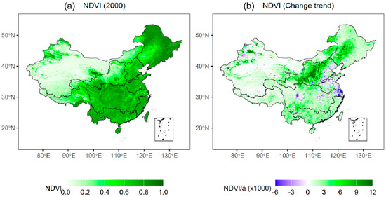 The spatiotemporal variability of NDVI in China: (a) Spatial distribution of NDVI, (b) NDVI trend from 2000 to 2023.