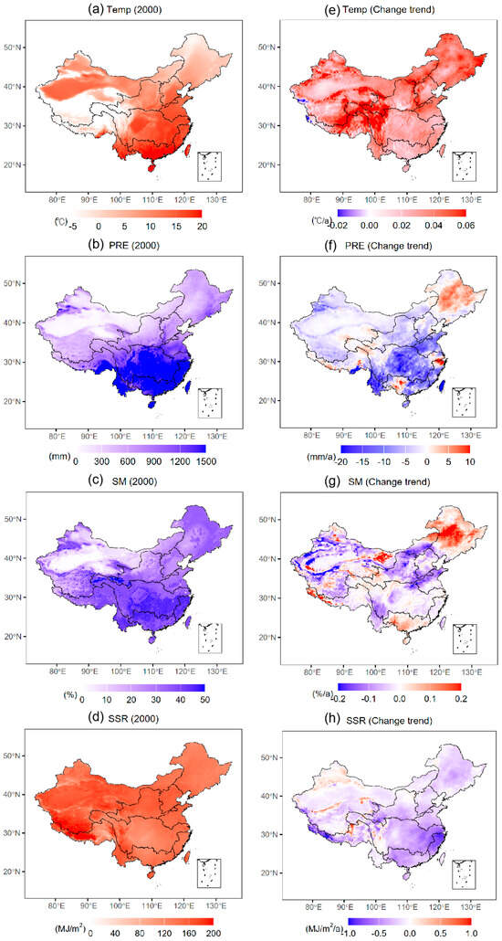 Figure 4 presents the spatial distribution and trends from 2000 to 2023 of the main climatic variables influencing NDVI. Temp, PRE, SM, and SSR represent the surface temperature at 2 m, precipitation, soil moisture, and net solar radiation, respectively. The results indicate that China’s climate exhibits significant regional differences, with precipitation and soil moisture showing a pronounced pattern of being higher in the southeast and lower in the northwest, similar to previous reports [39]. Influenced by topography and altitude, the Qinghai-Tibet Plateau has the lowest annual average temperature and the highest net radiation intensity.