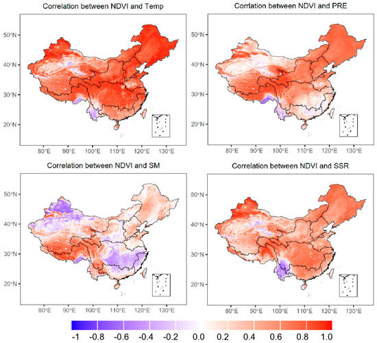 Correlation analysis between NDVI and meteorological factors. (Temp, PRE, SM, and SSR represent the surface temperature at 2 m, precipitation, soil moisture, and net solar radiation, respectively. The number of data pairs analyzed is n = 12 × 24, representing monthly values over 24 years).