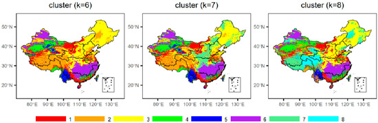 Table 1 presents the mean correlations between NDVI and climatic variables for the different categories (when k = 7). It can be found that there are significant differences in the correlation distribution characteristics among different clusters. For instance, in Cluster 1, the mean correlations between NDVI and precipitation, temperature, soil moisture, and net solar radiation are 0.34, 0.53, 0.25, and 0.34 (as shown in Table 1), respectively, indicating that vegetation in these areas responds relatively evenly to multiple climatic factors, with moderate impacts from each factor on NDVI. In Cluster 2, NDVI exhibits high correlations with precipitation and temperature, with mean values of 0.75 and 0.78, respectively, while the correlations with soil moisture and net solar radiation are also relatively high (0.66 and 0.50). This suggests that vegetation dynamics in these regions are strongly driven by comprehensive climatic conditions, particularly precipitation and temperature. In Cluster 3, NDVI has the highest correlation with temperature (0.83), followed by precipitation (0.67) and net solar radiation (0.58), while the correlation with soil moisture is lower (0.26). This indicates that temperature is the primary driver of vegetation changes in these areas, with precipitation and net solar radiation also contributing to some extent. In Cluster 4, NDVI shows low or even negative correlations with climatic variables. The mean correlations with precipitation and soil moisture are −0.02 and −0.16, respectively, suggesting that the relationship between vegetation and climatic factors in these areas is more complex, possibly influenced by non-climatic factors (e.g., land use) or other unconsidered environmental variables. In Cluster 5, NDVI has negative correlations with temperature and net solar radiation (−0.08 and −0.34) and low correlations with precipitation and soil moisture (0.02 and 0.29), indicating that vegetation dynamics in these areas are less sensitive to climatic factors and may be primarily driven by non-climatic factors. In Cluster 6, NDVI shows high correlations with temperature and net solar radiation (0.76 and 0.63), while the correlation with precipitation is relatively low (0.21) and negative with soil moisture (−0.35). This suggests that vegetation in these regions is mainly driven by temperature and radiation conditions, while soil moisture may impose certain limitations on vegetation changes. In Cluster 7, NDVI exhibits the highest correlation with temperature (0.85), followed by net solar radiation (0.60) and precipitation (0.63), while the correlation with soil moisture is low and close to zero (−0.05). This indicates that vegetation changes in these regions are primarily driven by temperature, with precipitation and solar radiation also playing important roles. Overall, the different clusters reflect the distinct response characteristics of NDVI to climatic factors in various regions, providing valuable insights for further analysis of the driving mechanisms behind vegetation dynamics.