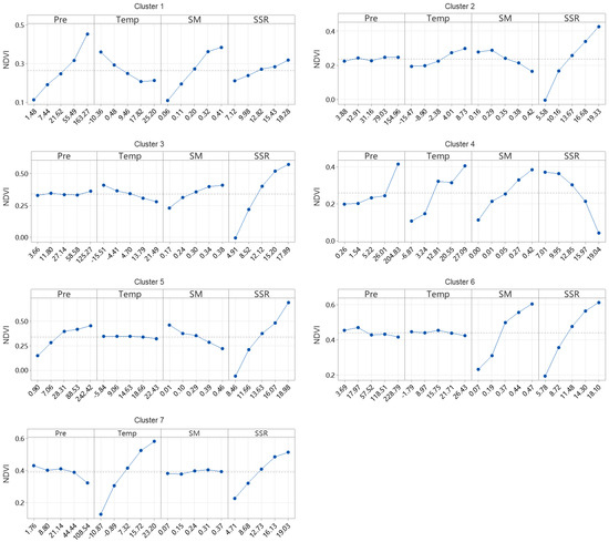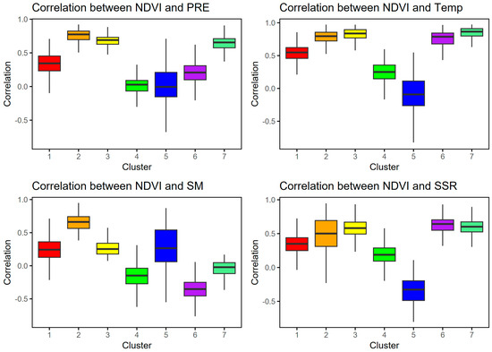 Figure 8 presents box plots of the correlations between NDVI and climatic variables for different clusters. A comprehensive analysis of the correlations between NDVI and environmental factors (precipitation, temperature, soil moisture, and radiation) across different clusters reveals significant variations in the influence of these factors on NDVI. Firstly, regarding the correlation between NDVI and precipitation (PRE), most clusters exhibit a strong positive correlation. Notably, in Cluster 2 and Cluster 3, the influence of precipitation on NDVI is particularly significant, with the median correlation in Cluster 2 reaching 0.77, ranging from 0.51 to 0.92, indicating high stability. In contrast, Cluster 5 shows significant variability, with a median correlation close to 0, ranging from −0.68 to 0.71, suggesting that the influence of precipitation on NDVI is more complex or even negligible in this cluster. Secondly, the correlation between NDVI and temperature (temp) reveals a highly significant positive correlation. In Cluster 3, the median correlation is as high as 0.84, with a range from 0.58 to 0.97, indicating strong consistency and stability. Cluster 6 and Cluster 7 also exhibit significant positive correlations, with median values of 0.79 and 0.86, respectively. However, the temperature correlation in Cluster 5 shows a slight negative trend, with a median of −0.09, suggesting that in this region, NDVI may be influenced more by other factors. Notably, Cluster 4 shows the greatest fluctuation in correlation, ranging from −0.17 to 0.60, indicating that the influence of temperature on NDVI in this region is uncertain. Regarding the correlation between NDVI and soil moisture (SM), the results vary greatly across clusters. In Cluster 2, the correlation between NDVI and soil moisture is relatively high, with a median of 0.56, ranging from 0.38 to 0.74. However, in Cluster 6, the correlation is distinctly negative, with a median of −0.46, ranging from −0.76 to −0.25, suggesting that higher soil moisture may inhibit NDVI in this Cluster. Additionally, Cluster 5 shows a more neutral trend, with a median of 0.06, indicating that the influence of soil moisture on NDVI is minimal or confounded by other factors. Lastly, the correlation between NDVI and radiation (SSR) generally shows a consistent positive relationship. In Cluster 3 and Cluster 6, the median correlations are 0.58 and 0.64, respectively, indicating a significant promoting effect of radiation on NDVI. However, Cluster 5 is an outlier, with a median correlation of −0.33, ranging from −0.80 to 0.11, indicating a negative correlation that may be influenced by regional climate or topographical factors. Moreover, Cluster 1 shows a relatively weak positive correlation, with a median of only 0.35, suggesting a limited role of radiation in affecting NDVI in this group.