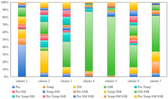 Figure 9 presents an analysis of the major contributing factors and their interactions across different clusters. The results indicate significant regional differences in the drivers of NDVI, including precipitation (Pre), temperature (Temp), soil moisture (SM), and solar radiation (SSR). In Cluster 1, precipitation is the primary contributing factor, accounting for 43%, highlighting the high dependence of vegetation growth on water availability, which may be associated with arid or semi-arid regions. In contrast, the contribution of precipitation in Cluster 7 is only 5%, indicating a lower dependence on water in areas likely to have sufficient water supply. SSR dominates in Clusters 4 and 5, contributing 80% and 79%, respectively, suggesting that vegetation in these regions is primarily limited by solar energy, possibly in tropical or high-radiation environments. In Cluster 2, the direct contribution of soil moisture reaches 29%, emphasizing the importance of soil water availability in humid areas or irrigated agricultural regions. The influence of temperature is more evident in its interactions with other factors [41], such as Pre:Temp and Pre:Temp:SM, which show significant contributions in Clusters 3 and 6, reflecting the critical role of the synergy between precipitation, temperature, and soil moisture.