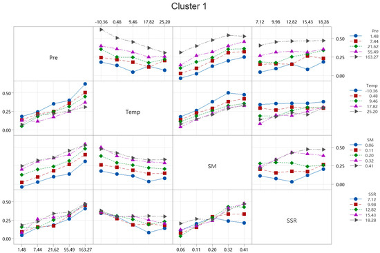 Interactive effects of multiple climatic factors on NDVI in Cluster 1. The results for Clusters 2 through 7 are presented in the Supplementary Materials (Figures S1–S6).