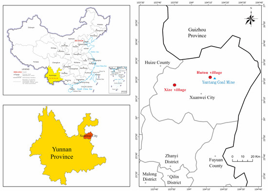 Maps showing sampling localities Hutou and Xize villages in Xuanwei City. (In the images on the left, yellow area represents Yunnan Province, red area represents Xuanwei city; In the image on the right, red font represents villages, blue font represents coal mine in Xuanwei city).