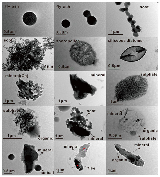 Soot and tar balls are the results of incomplete fossil fuel combustion [33,34,35,36], in the Xuanwei particles the fossil fuel source will overwhelmingly be the local coal. Soot, a solid product, consists of nanoparticulate carbon spheres that form individually and then aggregate to form morphologically distinct chain-like or clusters that are considered individual particles. Residential firewood burning mainly emits pure carbonaceous particles (including organic matter (OM) and soot particles) [37,38]. Tar balls are microscopic droplets of highly viscous hydrocarbons and can be identified under electron microscopy by their unstable behavior under the electron beam, whereas the glass fly ash spheres are stable under the beam. In addition, biological particles such as sporopollen and siliceous diatoms showing excellent preserved structure were identified and are included in the ‘organics’ classification. Primary carbonaceous particles such as tar balls and soot warrant further attention due to their strong light-absorbing properties, presence of toxic organic constituents, and small size, which can impact human health [39].
