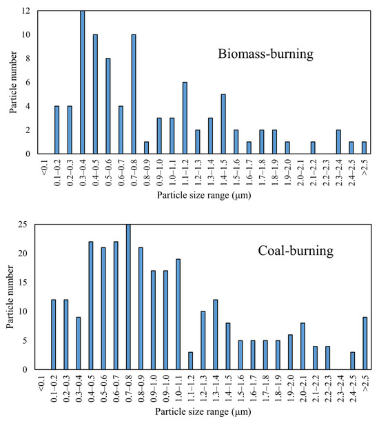 In a comparison of particles from biomass-burning and coal-burning, the particles from coal-burning are abundant over the size range of 0.4–1.1 μm, and the number of particles from biomass-burning over the size range of 0.3–0.8 μm. Particles with sizes larger than 2 μm are rare from both fuels.