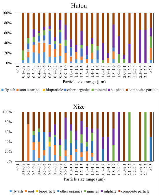 All the particles are classified into 7 types and the distribution in the 26 size ranges is plotted (Figure 7). Composite particles were the most abundant in all size ranges in both villages. In Hutou village, the percentage of composite particles shows two peaks in the small size range (0.1–0.2 μm) and the large size range (2–2.3 μm). In Xize village, the percentage of composite particles shows an even distribution in all size ranges. Mineral particles in Xize were most abundant in almost every size range when compared to Hutou village.