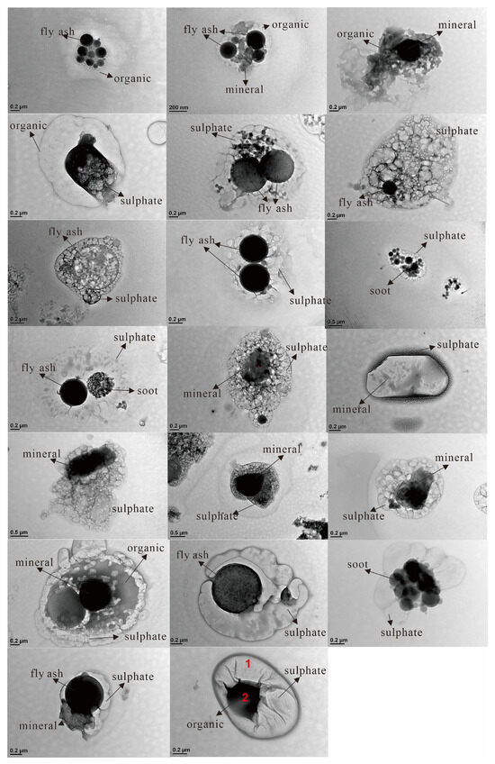 For composite particles, aerosols derived as secondary sulfates and nitrates are important compounds to envelope solid core particles such as minerals, metal-containing, fly ash, and soot [28,52,53,54,55,56]. The heterogeneous reactions of alkaline minerals and NaCl with SO2, NOx, and their acids (HNO3 and H2SO4) can produce hygroscopic nitrates and sulfates [57,58]. Most composite particles are formed through condensation, coagulation, and cloud processing during atmospheric transports; only a small fraction are directly emitted from sources [17]. Soot aging mechanisms revealed that condensation dominates fresh soot aging when the particle diameter is <400 nm; coagulation leads to multi-soot cores in a particle with a diameter >400 nm [59].