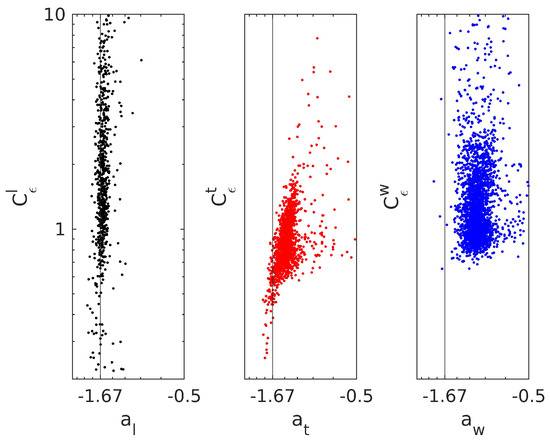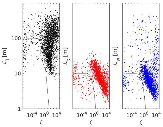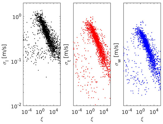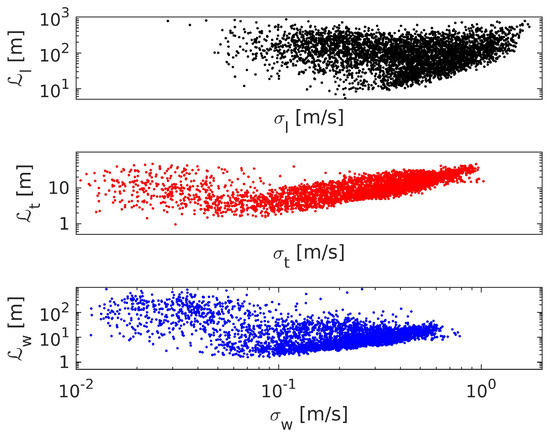 The integral length scales , and as functions of the corresponding standard deviations of the longitudinal , transverse (cross-stream) and vertical velocity components are presented in Figure 2. As can be seen, and are much larger than the corresponding statistics of the horizontal transverse and vertical components, which indicates that the flow is still strongly anisotropic at m. Apart from the surface vicinity, the anisotropy could be caused by the presence of submeso motions, which affect mostly the horizontal components [21]. The scatter of the results is also much larger for the longitudinal component. This is to be expected, as larger length scales require larger averaging windows. On the other hand, when the averaging windows are too large, information on the time variability of the statistics is lost. We chose an averaging window of 20 min as the best compromise. It enables the calculation of the length scales of the transverse and vertical components with satisfactory accuracy.