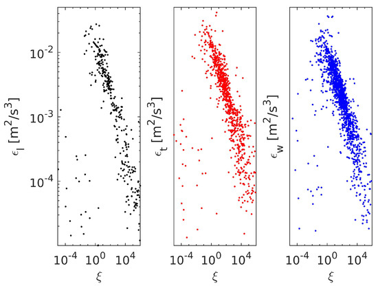 The energy dissipation rate as a function of the stability parameter (cf. Equation (19)), estimated from the time series measured at m.