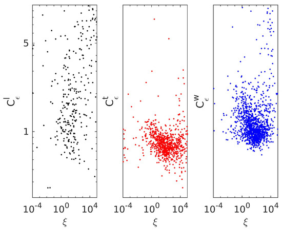 where the coefficient . In non-equilibrium decaying turbulence, the length scale may initially decrease with time and next start to increase [33]. Such tendencies were also observed in atmospheric turbulence during the decay of the convective layer [34]. Generally, the non-constancy of the coefficient will indicate changes in the leading-order balances in the kinetic energy equation. We can expect that will tend toward unity in the stationary case.