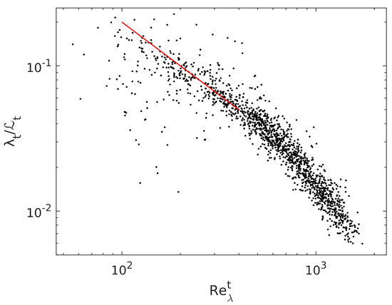 and as a function of the Reynolds number are presented in Figure 8 and Figure 9. A subregion of the classical scaling with in Equation (2) is visible only at a restricted range of . For a high , clearly .